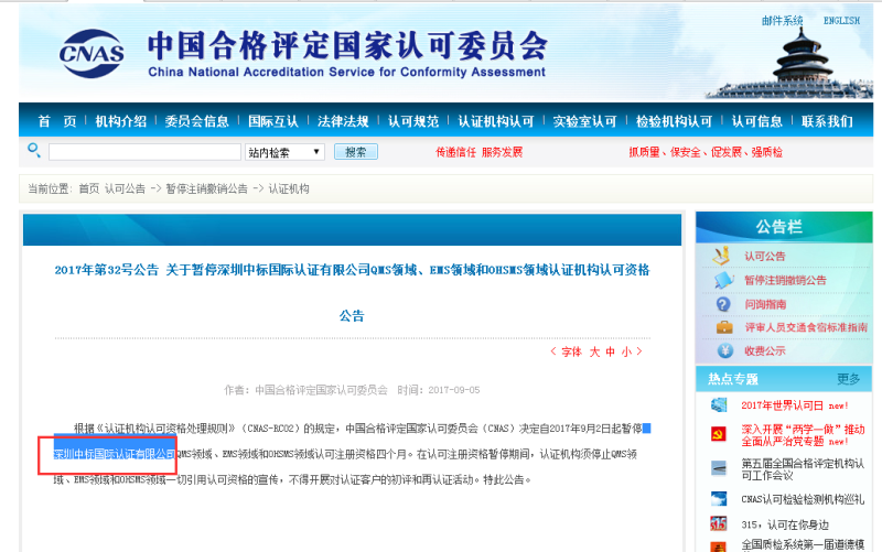 近期接到各方詢問我機構是否被暫停。在此說明:我機構全稱中標聯合(北京)認證有限公司,被暫停的機構是深圳中標國際認證有限公司。與我機構無任何關系。感謝各方關心。