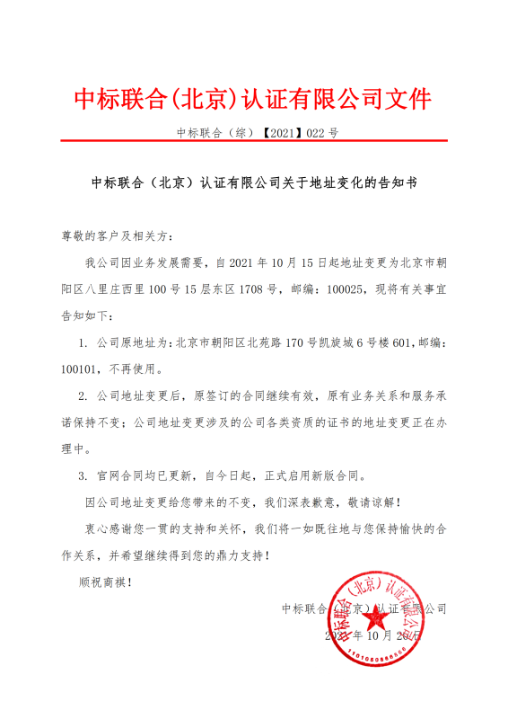中標聯合(北京)認證有限公司關于地址變化的告知書