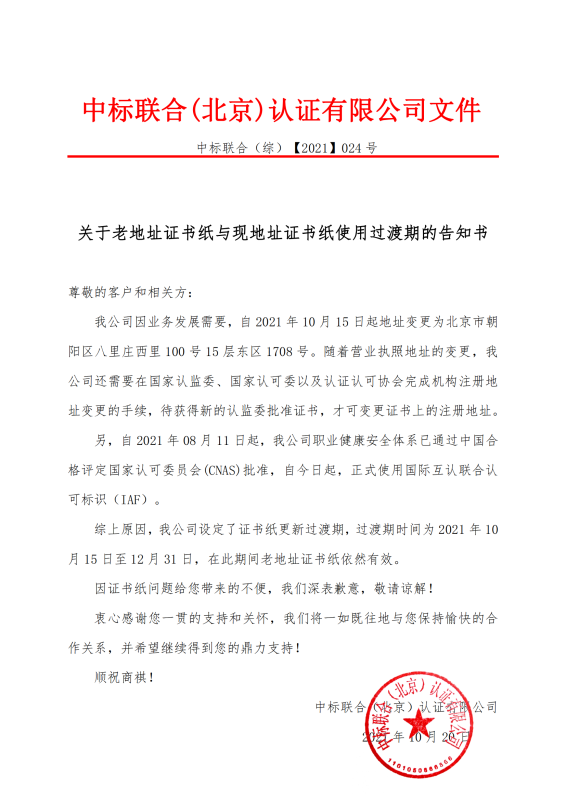 關于老地址證書紙與現地址證書紙使用過渡期的告知書