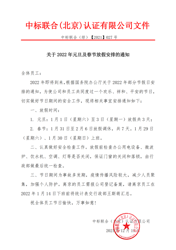 關于 2022 年元旦及春節(jié)放假安排的通知