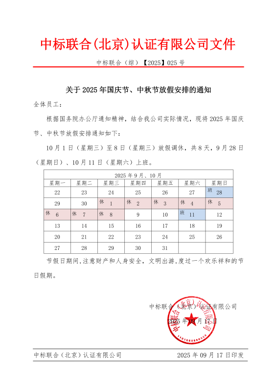 關于 2025 年國慶節(jié)、中秋節(jié)放假安排的通知